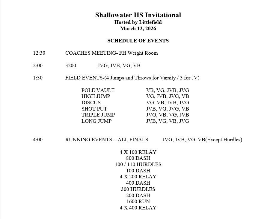 Shallowater Invitational - Schedule of Events